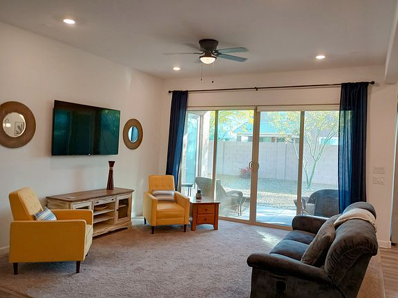 Fully furnished 3 bedroom/2 bathroom open floor plan with 10' ceilings in Blue Horizon neighborhood just off Jackrabbit Trail. This home sits in a cul-de-sac and is an excellent spot to lay your head while exploring the area or when building your dream home! The home is equipped with all you need... just bring your bags! There are plenty of dark espresso cabinets, white quartz counters, gourmet kitchen with stainless steel appliances, and an attached 3-stall garage with room for more on the driveway. You'll find comfortable bedding, linens and bathrooms supplies to meet your needs. The kitchen has pots, pans, dishes, utensils, a coffee pot and even an Instapot for quick dinners. Ample garage has 3 stalls (2 are tandem). The patio has a small grill and some comfortable outdoor seating to enjoy the warm evenings. Very easy 30 minute commute to PHX. An added $400 monthly utility fee will pay for all utilities including internet. A small dog can be considered with an additional $300 nonrefundable pet deposit. No smoking allowed inside home. This home also has an attached 1 bedroom unit that has it's own entrance and is rented out separately (this space is completely separated from the main home). If you prefer working with private owners that value relationships with their tenants, this is your property!