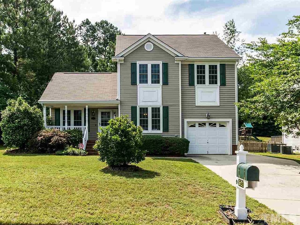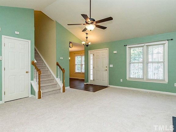 BRAND NEW CARPET! SOME NEW PAINT! NEW VINYL IN LAUNDRY! Clean & bright & move-in ready! Gorgeous covered, rocking chair front porch, family room w/ Cathedral ceiling, ceiling fan, gas log fireplace & BIG WINDOWS. "Wood" laminate in foyer, dining room and kitchen w/ 42" cabinets, breakfast nook, tile backsplash, pantry, slider to large deck & great backyard w/ stacked stone creek/waterfall/pond & shaded sitting area in addition to brick paver patio. Formal dining area, wainscotting, 2" blinds. LOVELY!