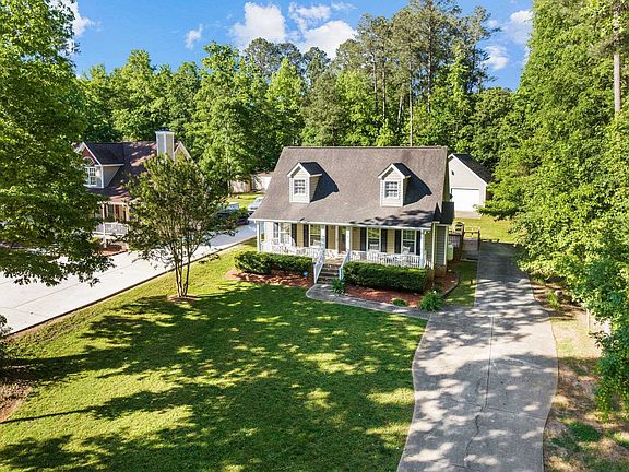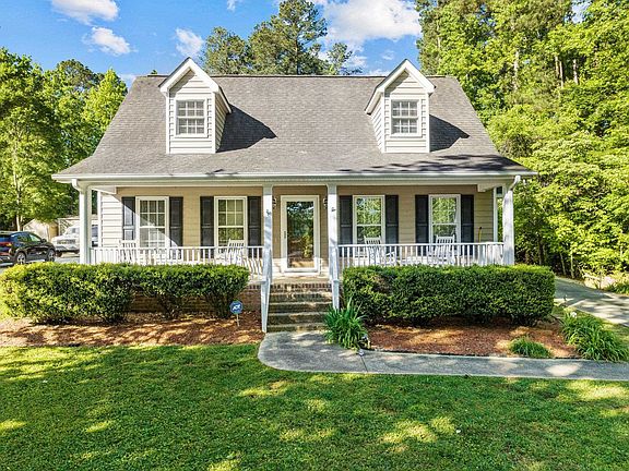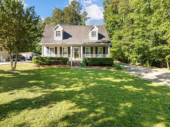 Live the Lake Life at LAKE ROYALE in this wonderful 3 bd 2 full bath and 1 1/2 bath Cape Cod style home with rocking chair front porch with lake views! 1st floor primary bedroom with walk in closet and 2 additional bedrooms on second floor. Large 40x30 garage located behind house with office and separate storage room. Also has large, covered area on the side of the garage. The gated community offers a lot of amenities including 345-acre spring fed lake, clubhouse, basketball court, tennis court, beach areas for swimming, boat ramps and much more. Lake Royale has its own police department, maintenance department and gate personnel. There is also a public 18-hole golf course. Look no further for a great place to live!