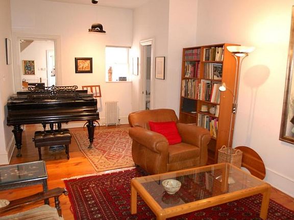 Victorian townhouse, brick exterior, halfway between Franklin & Marshall College and Central Market. LR, DR, K, half-bath on first floor, BR, BR or family room, bath, Master BR with bath/laundry/sauna on second floor. Third floor has been opened up into an air-conditioned office with built-in cherry desk, bookshelves, cupboards, light from north and south. Heating is gas-heated hot water/radiators. Neighborhood Description This house is at the edge of the historic district on a tree-lined street in the most desirable few blocks of Lancaster's West End. Within a one-block area the housing ranges from modest townhouses to multifamily homes to million-dollar mansions. There is an art gallery across the street and a cafe on the corner. There are numerous churches within a couple of blocks.