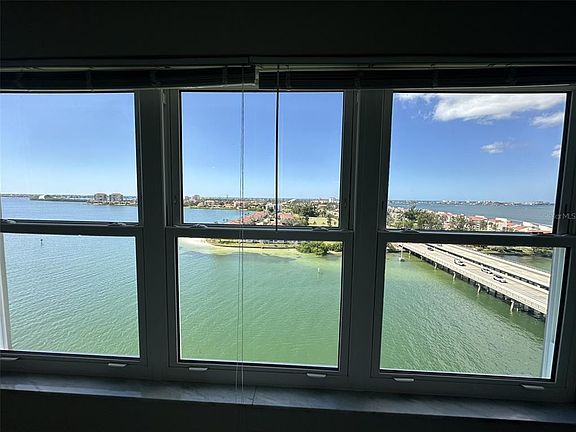 Light & bright, spacious open concept unfurnished 1 BR, 1BA condo with fabulous water view overlooking Tampa Bay and Boca Ciega Bay, newer impact Weather Tite PGT windows (2019), H2O (3/19) and a 55+ community full of amenities! Large bedroom with great views, walk-in closet, and bathroom with tub/shower combination. Second sink area in bedroom could be removed and used as dedicated home office/planning station space. Kitchen is open to dining/living areas so no pony wall tear-down is needed. Resort style 55+ community offers 4 heated pools, in ground spa, shuffleboard, kayak storage (to be rebuilt), Residents Club with fitness center, sauna, ballroom, poker & other games in the club rooms, billiard room, tennis/pickleball courts, meeting rooms, yoga/group class room, arts and crafts. Building Five has it's own pool area with waterfront dock/boat slips being re-built, new tiki hut & tables & grills. On the corner of Point Brittany near the Resident's Club is "The Country Store" for your convenience, serving prepared foods, specialty meats, fresh vegetables, wine & beer.. Everything you need without leaving the community! Laundry is free to use for residents featuring a full size washer/dryer utility room and a trash shoot on every floor. Large storage unit on same floor, and assigned parking on upper level space #109. Point Brittany is in the perfect location only 10 min drive to St. Pete Beach and 10 min drive to downtown St. Pete. Water/sewer/trash, ext. cable, Internet & WiFi included in monthly HOA fee. One small dog 20 lb. under or 2 cats, 2 quiet birds, or 1 fish aquarium 20 gall or less allowed in Building 5. No motorcycles, RVs or golf carts, residential trucks must fit in parking space and have no lettering/signs. Please verify all rules-regs.