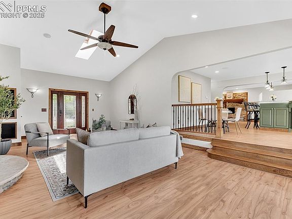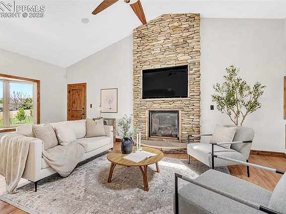 Amazing Pikes Peak view on nearly an acre. This home in Vista Grande Estates will not disappoint, walk into the vaulted ceiling living room with grand stone fireplace and tons of natural light. The designer kitchen with expansive island, granite countertops, mosaic tile backsplash, gas cooktop and mountain views is a true delight. A second fireplace and sitting room directly off the kitchen helps you stay connected to the cook. The enclosed deck with glass surround and gas heater has unmatched views and will become a favorite hang out for you. This home is great for entertaining as the kitchen opens to the living, dining and enclosed deck. Hard surfaced flooring throughout the main and upstairs, plus in ceiling speakers. Check out the deep 3 car garage, perfect for all your projects and storage needs. Main floor has two bedrooms with a full bath and laundry room. Want a true primary retreat, walk upstairs to a huge bathroom with a large custom walk-in shower with dual heads, dual vanities and two walk-in closets. The primary bedroom with vaulted ceiling bedroom has built in shelves and cabinetry, fireplace, sitting area and more mountain views. The walk out basement has a great rec room with wet bar, two additional bedrooms and full bath. The atrium with LVP can be a great work out area or kids play space. The property sits on nearly a full acre with plenty of space for all your recreation needs.