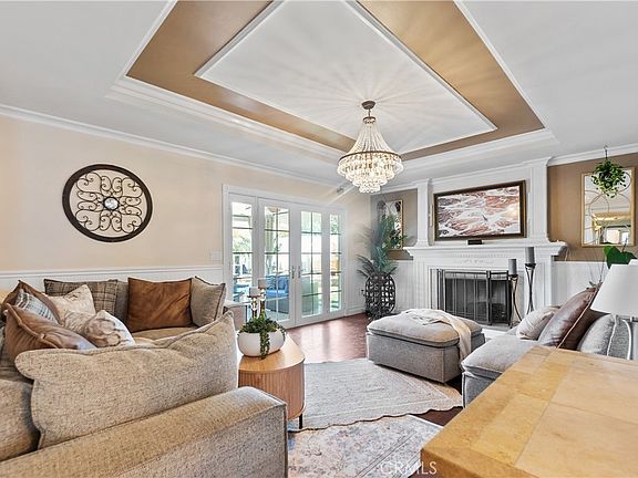 Elegant custom molding throughout. Spacious living room with decorative fireplace and French doors to the backyard. The dining area features built-in bench seating perfect for family meals. Completely remodeled kitchen with white cabinetry, stone countertops, stainless steel appliances, modern lighting, and a huge walk-in pantry
