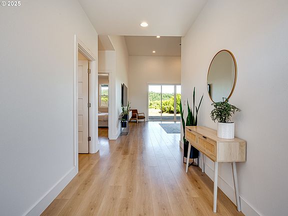 Sitting on 8 acres in the heart of Willamette Valley Wine Country, this custom-built home encompasses country living. You will be spoiled with views of the Coastal Range from the front porch, and beautiful farm and vineyard views from the covered back deck. With 2,200 square feet on the main level, this home is ideal for all buyers. When you walk into the home, you are greeted with 14-foot-tall ceilings and ample natural light, courtesy of custom-made sliding doors that allow for stunning views from your living area. The open kitchen boasts a large island with quartz countertops and soft-closing cabinetry. The three bedrooms are spacious, featuring walk-in closets, and there is potential for a fourth bedroom on the second level, located just next to the large bonus room. The primary en-suite is extremely spacious, with direct access to the back porch. The bathroom features a black, standalone tub, dual vanities, and a large walk-in tile shower. With a private water closet, linen storage, and a roomy closet, this main-level primary is sure to please. The laundry area features additional cabinetry and storage, with a deep utility sink overlooking the front yard.As mentioned earlier, sliding glass doors provide access to a nearly 65-foot-wide, covered back deck. This is a great space for entertaining, featuring stunning views of rolling hills, vineyards, and farmland. The barn measures 30 feet by 40 feet, with two large sliding doors. There is a sizeable fenced area, great for pets and kids. Approximately 6.5 acres of Woodburn soils are located within the prized Dundee AVA region. This portion of the property is currently planted with grass and will be harvested this summer. This allows for lower taxes through farm deferral. This property will serve as a great foundation for Willamette Valley living, with convenient access to HWY 99, and HWY 18. With room to grow and an abundance of space, 5220 NE Duniway Road is ready to welcome its next owner.