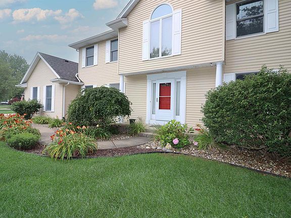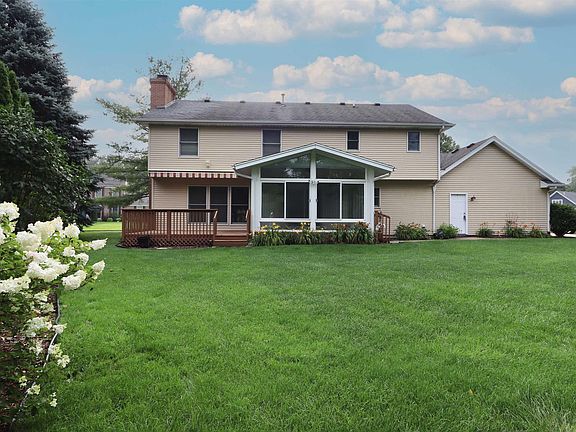 This lovely 2 story house in Granger's Brendon Hills has 4 bedrooms, 2.5 bathrooms, a beautiful and large kitchen, a 3 season sun room, plus a deck with a motorized awning. The house has a formal dining room, a family room with 3 floor to ceiling windows, a gas fireplace, and a living room with glass doors, which could be used as an office. The u-shaped kitchen with granite counters has fabulous counter and cabinet space, an eat-in area, and a side counter with a built-in desk. The laundry and half bath are on the main level. The upstairs has the main bedroom with cathedral ceilings, a spacious private bathroom with a double vanity, a walk-in shower and separate tub, and a walk-in closet. The other 3 bedrooms and another full bathroom are on this upper level. The lower level has a family room and also unfinished space for storage. The sun room off the kitchen and family room is your gateway to the landscaped yard and private deck. Updates include: roof, furnace, septic field and tank in 2012; sump pump 2024. Close to walking paths, schools, & grocery stores.