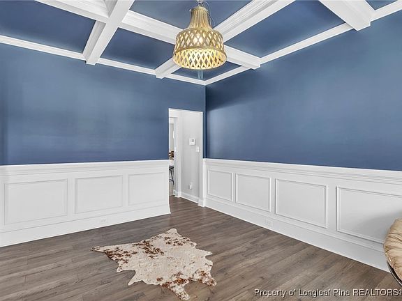 Step inside to find luxury vinyl plank flooring and a spacious kitchen featuring granite countertops, stainless steel appliances, an oversized eat-in island, and a formal dining room with elegant coffered ceilings—a true entertainer’s dream.