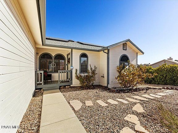 This unique, contemporary style home is a must see! 3 bedrooms and 2 bathrooms with 1441 square feet of living space and no HOA. Interiors are light and bright with an open/functional floor plan. An enclosed sunroom provides panoramic views of Mingus Mountain and the space is an addition to the home's original square footage. Downstairs has an unfinished crawl space that is great for storage, a future addition, or a mother-in-law suite. RV parking and a low-maintenance landscape with a separate fenced in garden area or dog run. Large 12'x16' detached shed is drywalled, insulated, and has new flooring. Perfect for a yoga studio, homeschool room, workout gym, or a workshop. Solar panels keep those electric bills low throughout the year. Book your showing today!