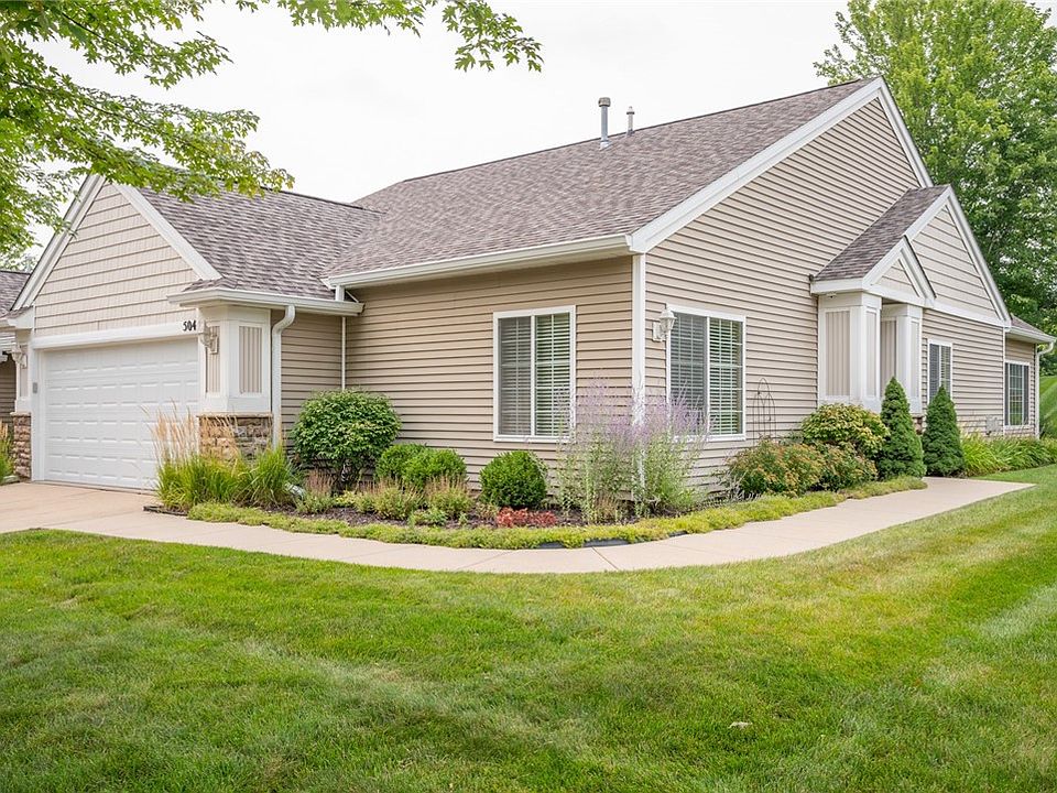 This 2 bedroom, 2 bath ranch townhome has been preinspected, radon tested and very well taken care of! The curb appeal is top notch with the landscaping (all perennials) and an irrigation system! As you step inside from the attached garage (with built in storage), you'll enjoy the perks of this kitchen: granite island to counter seating, eat in area, spacious pantry and all appliances stay! The kitchen opens to the family room - the fireplace, mantel and built in's allow for great options to decorate and make this room feel just like home. The sunroom has French doors with a vaulted ceiling - what a great room that can serve many purposes! The washer/dryer are located down the hallway to the spacious bedrooms. The master suite has a walk in closet along with a great walk in double shower. Both bathrooms have been renovated, handicap accessible. (Updates: roof/downspouts/gutters/garage door/garage opener)