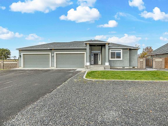 MLS# 289322 Nestled on a peaceful ½-acre lot in Pasco, this stunning property offers exceptional space, comfort, and outdoor living—including a 4-car garage and a sparkling inground pool! Built in 2018, the home features 3,614 sq. ft. of beautifully designed living space in a well-planned 1-level with daylight basement layout, offering 6 bedrooms and 3 bathrooms. The inviting great room showcases a cozy fireplace with built-in shelving, a bright interior with large windows & slider access to the deck, and tile flooring that runs throughout the main level living areas. The chef’s kitchen is equipped with white cabinetry, quartz countertops, a full tile backsplash, island with breakfast bar and beverage fridge, stainless steel appliances, and a generous pantry with a glass door. Enjoy both casual meals and special occasions in the spacious dining area. The main-level primary suite includes a recessed ceiling with ceiling fan, a spacious custom closet, and a private spa-inspired ensuite featuring a dual-sink vanity, jetted tub, and massive tiled shower. The laundry room adds convenience with cabinetry, a utility sink, and a built-in bench for extra storage. The daylight basement expands your living space with the 6th bedroom that is large enough to be a bonus/theater room, and a large family room with laminate flooring, a wet bar, and direct access to the backyard—perfect for entertaining or multi-generational living. Step outside to a fully fenced backyard that feels like a retreat: gate access for boat or RV parking, covered patio and deck areas for year-round enjoyment, a spectacular 20x40 in-ground pool with a brand-new liner (2024), and an electric automatic pool cover for safe and easy maintenance. A generous lawn area and matching storage shed complete the outdoor space. With an attached 4-car garage, plenty of off-street parking, and a serene setting just minutes from premier West Pasco amenities, this rare property offers the perfect blend of country-like tranquility and modern convenience.