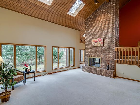 Come discover this beautiful home today! It is nestled on a professionally landscaped private lot and is a wonderful place to spend the summer days. Step inside the spacious open floor plan with soaring ceilings and an abundance of natural light. The eat-in kitchen offers a double sided fireplace, quartz countertops, new (2018) Bosch dishwasher, Jenn-Air gas cooktop, Electrolux built-in oven and microwave and much more. The wet bar is conveniently located for all of your entertaining needs. Enjoy the comfort of the great room that has lovely views of the partially wooded backyard. A large first floor master suite features gorgeous hardwood floors and 2 walk-in closets. Pocket doors lead to an additional room that is perfect for a den, nursery or office. The upstairs offers 3 large bedrooms, a five-piece full bath with double vanity and a hallway overlooking the magnificent great room. This home is immaculate and has been lovingly cared for. Many updates have been made: new roof and skylights with eco-efficient auto shade in 2019; new window coverings and carpet throughout home; vinyl siding replaced in 2016; nearly all interior and exterior lighting updated to LED; new gutter guards, soffits, fascia and downspouts in 2019; new fiberglass front doors; professionally landscaped in 2014; chimney sealed; insulation added to attic; water heater in 2014. HOA includes pool and tennis court access. Don't miss out on this conveniently located gem! Schedule your showing today!