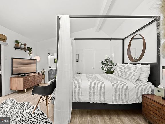 Stunning 5 bedroom, 3.5 bath contemporary home renovated with design-inspired finishes throughout. This home boasts a bright and airy floor plan updated with eco-friendly flooring, renovated kitchen, and lower level, stylish lighting, new appliances and water heater, interior paint, new handrails, chimney cap, deck supports, and more! Enter through the double front doors to a sun-filled interior beginning with the spacious living room under a high vaulted ceiling with shiplap detail and skylights, and a rustic stone fireplace. You'll love preparing your favorite meals in the completely renovated kitchen highlighting beautiful open wood shelving and brushed brass detail, with stainless appliances and white quartz countertops with an adjacent dining room offering sliding door access to the deck. Off of the kitchen is the family room highlighting a floor-to-ceiling stone fireplace, additional deck access, and a powder room. Ascend the floating wood staircase to the primary bedroom showcasing a private balcony and walk-in closet, with a completely remodeled en suite bath, and a second bedroom completing this level. Perfect for guests, the lower level provides a bedroom, custom dry bar, a full bath detailed with a brick accent wall, a flex room with sliding door access to the patio and backyard, a laundry room, and abundant storage space. Enjoy outdoor living under mature shade trees on the deck and landscaped yard.