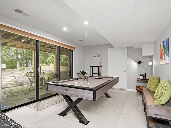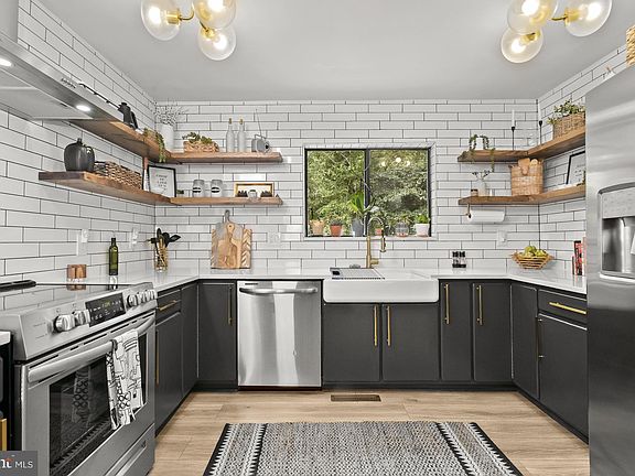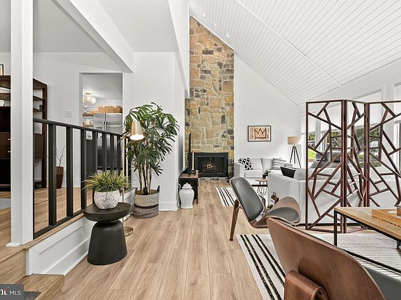 Stunning 5 bedroom, 3.5 bath contemporary home renovated with design-inspired finishes throughout. This home boasts a bright and airy floor plan updated with eco-friendly flooring, renovated kitchen, and lower level, stylish lighting, new appliances and water heater, interior paint, new handrails, chimney cap, deck supports, and more! Enter through the double front doors to a sun-filled interior beginning with the spacious living room under a high vaulted ceiling with shiplap detail and skylights, and a rustic stone fireplace. You’ll love preparing your favorite meals in the completely renovated kitchen highlighting beautiful open wood shelving and brushed brass detail, with stainless appliances and white quartz countertops with an adjacent dining room offering sliding door access to the deck. Off of the kitchen is the family room highlighting a floor-to-ceiling stone fireplace, additional deck access, and a powder room. Ascend the floating wood staircase to the primary bedroom showcasing a private balcony and walk-in closet, with a completely remodeled en suite bath, and a second bedroom completing this level. Perfect for guests, the lower level provides a bedroom, custom dry bar, a full bath detailed with a brick accent wall, a flex room with sliding door access to the patio and backyard, a laundry room, and abundant storage space. Enjoy outdoor living under mature shade trees on the deck and landscaped yard.