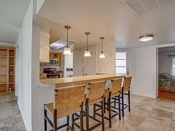 This extremely rare to market, dog friendly, 1 BR. 1.5 bath floorplan is the first to come on the market since 2021. Located in Seville Park, Villa Monterey, a 55+ community, This has a carport, community pool right off the patio is close to Fashion Square Mall, Old Town, the Indian bend wash parks w window views to trees which have grass underneath. It has a lovely patio w additional storage and an open floor plan. It has an updated kitchen with granite tops and an inventive and easily removable floating wall to shield the home office from the living areas. Home is newly painted & in good condition. It is a short uber ride to the entertainment district of Scottsdale, yet located in a quite retirement community. Being a single bedroom makes it easy to keep unwanted guests in a hotel