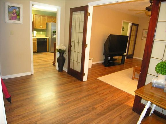 CHARMING HOME WITH ROCKING CHAIR FRONT PORCH * HARDWOOD LAMINATE THROUGHOUT (EVEN THE BEDROOMS!) * ENTRY FOYER WITH BEAUTIFUL FRENCH DOORS * COZY LIVING ROOM WITH STONE FIREPLACE & CEILING FAN * KITCHEN WITH GAS STOVE AND ROOM FOR A BREAKFAST TABLE * FORMAL DINING ROOM IS OPEN TO THE KITCHEN * SPACIOUS MASTER BEDROOM WITH CEILING FAN AND PRIVATE MASTER BATH * LARGE SECONDARY BEDROOMS WITH CEILING FANS * RENOVATED HALL BATHROOM WITH CERAMIC TILE FLOOR & GRANITE VANITY * LARGE UNFINISHED BASEMENT * SCREENED IN DECK WITH CEILING FANS LEADS TO BEAUTIFUL TREED BACKYARD.