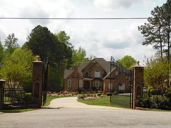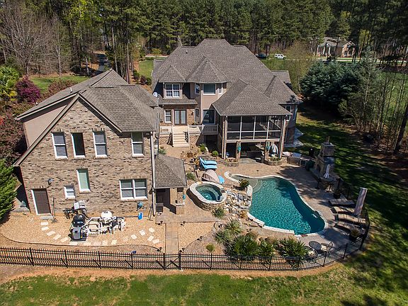 Privately gated waterfront Estate with separate huge 1300+ guest house included in sq footage and oversized second garage. Resort style backyard with saltwater pool and hot tub, waterfall and outdoor fireplace. Screened porch and lower covered porch, new boat lift and remote garage door on boat house as well as trex dock. Sandy beach and floating dock. Security system with camera. 2015 taxes were $2,739 Clover schools, no HOA fees. Total sq ft. 6000+