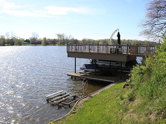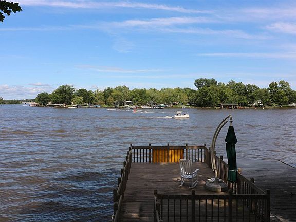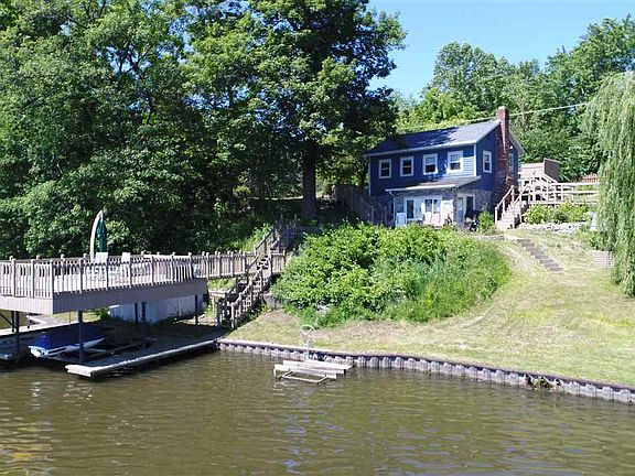This lake getaway has all the waterfront improvements you could ever want! 225' of waterfrontage on nearly a half acre, with a steel seawall, permanent covered boatlifts, and a shed at waterfront for all your water toys. Enjoy the lake view from the deck or patio by day, and spend your evenings at a campfire in the courtyard by night. Inside boasts an open kitchen/dining/living area with a gas log fireplace to cozy up to. Plenty of cabinets and a large kitchen pantry. Newer wood laminate flooring and bedroom built-ins added, and check out how many you can sleep in the two bedrooms! Newer roof, A/C, and the exterior is wrapped with attractive stacked stone. Large 22x36 garage, and a tiered, landscaped yard. You won't want to leave this lake getaway! Immediate occupancy!