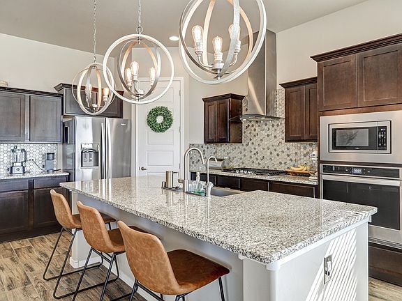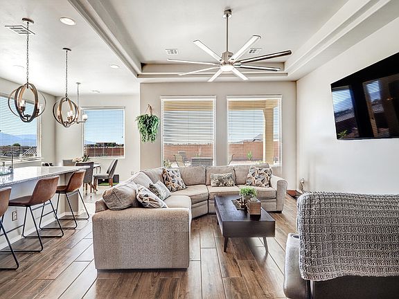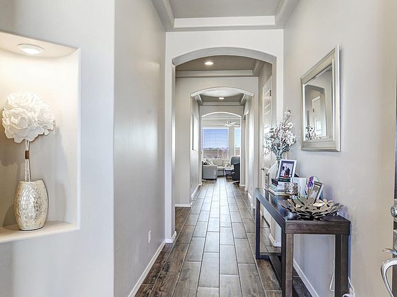 Beautiful Hakes home in desirable Lomas Encantadas with stunning Sandia Mountain views inside and out. The open contemporary floor plan highlights a gourmet kitchen with a large island & striking pendant lighting, flowing seamlessly to the living and dining areas. No carpet! Wood base & trim throughout plus elegant tray ceilings and 8' doors add to the upscale feel. The spacious primary suite includes a 13' x 7'4'' walk-in closet. It is built with an engineered roof truss system & a 3-ply built-up roof. With the 2015 NM Build Green certification, this home features a tankless water heater & insulated garage door. Enjoy a large covered and extended uncovered patio in the spacious backyard. Irrigation system in front and part of back. Community park (dog park too!) just across the street.