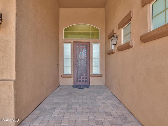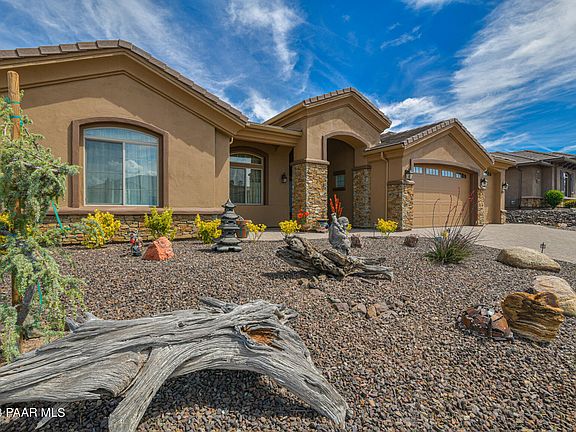 Impressive Carrington home in highly sought after Granite Dells Estates of Prescott. Timeless mountain views and a single level home with a generous 3000 SF well-thought-out floorplan. Extensive Owned Solar Sys with battery backup, tile throughout, 12' coffered ceilings, corner stone fireplace, Low E windows, zero threshold entry points with no steps! Spacious primary suite offering extensive closet space + workout area, a junior suite perfectly private for guests, a 3rd bedroom, 3rd bath plus office allow provide room for everyone! The outside area provides additional living space with multiple paver patios and lighted ramada. This home also features a water storage, 4 car garage with a 9' and 10' doors and storage shed! Please read the Feature Sheet for a Full List of Amenities!