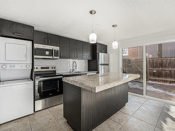 This charming 2-bed, 1-bath end-unit home is nestled in a fantastic Arvada neighborhood. Inside, you'll find new carpet, updated stainless steel appliances, a kitchen island with granite countertops, and the convenience of an in-unit washer and dryer. The balcony door opens to a spacious patio with extra storage and a gate, perfect for pets. The full bathroom boasts dual sinks for added comfort, and the home features thoughtfully selected light fixtures. Freshly painted throughout, it's move-in ready. You'll love being close to the newly revitalized Olde Town Arvada, which offers a vibrant dining scene and the Arvada Library, a community hub offering various resources and events. Public transit options, including the G Line commuter rail and RTD bus services, are easily accessible. Plus, you're just minutes from I-70, providing easy access to downtown Denver and the mountains. This home is perfect for comfortable and convenient living!