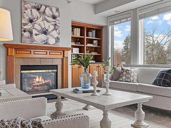 Spacious 2 bedroom + den condo located at Ron Clark built Grandview Square! Living room features custom built-ins, floor to ceiling windows, and gas fireplace. Spacious kitchen with cherry woodwork, prep island, walk-in pantry, and granite counters. Relax on the maintenance free covered balcony. Private primary suite (opposite other bedroom) has en-suite bath with separate tub/shower and walk-in closet. Versatile flex room works great as den/office/craft room/exercise space. Laundry room offers full size washer/dryer and built-in storage. Unit comes with underground parking and storage unit. Beautiful grounds showcasing patio, pond, and green space. Building has been exceptionally maintained, in addition to public areas being recently refreshed, including community room, fitness center, guest suite, and hobby room. Fabulous Edina location, walkable to dining and shopping, with easy access to Hwy 100.