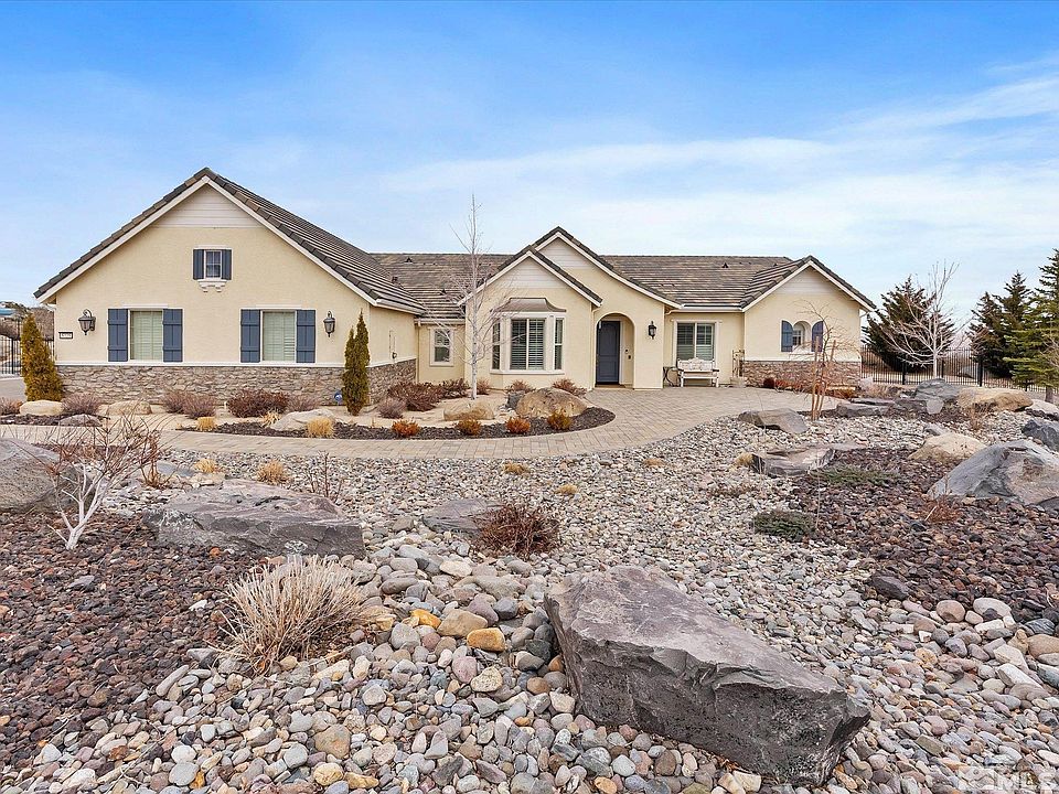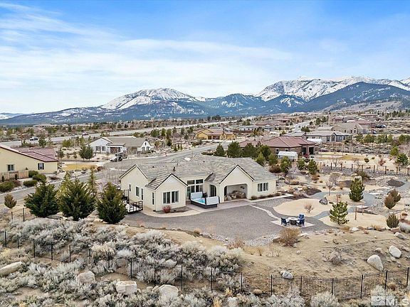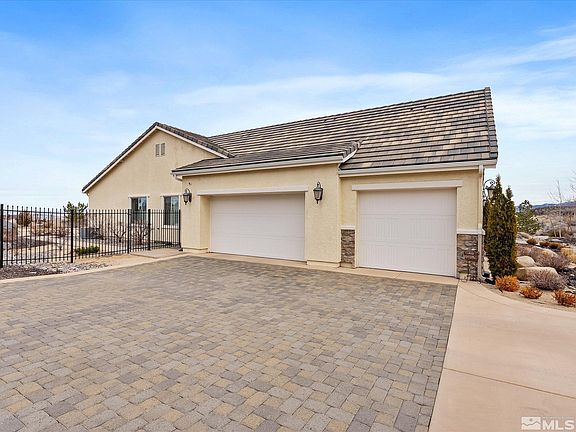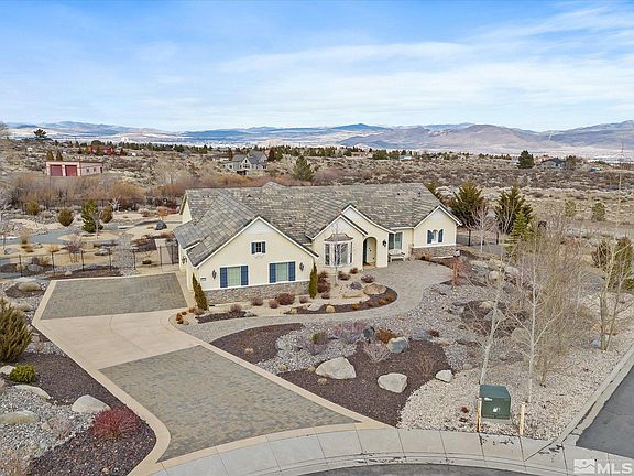 Tucked away on a private cul-de-sac with stunning mountain and city views, this French countryside-inspired estate blends elegance and tranquility. Soaring ceilings, rich hardwood floors, and abundant natural light create a warm, inviting ambiance. The gourmet kitchen is the heart of the home, perfect for gathering. Outside, a beautifully landscaped, wind-protected backyard offers serene privacy, while the home’s prime location ensures peace and quiet. South Reno luxury living at its finest!, Step inside this stunning luxury home and experience refined elegance at every turn. With soaring ceilings, large windows and rich wood floors, the open-concept design is bathed in natural light, enhanced by Hunter Douglas plantation shutters throughout. A breathtaking floor-to-ceiling stacked stone fireplace anchors the living space, creating a warm yet sophisticated ambiance. The chef’s kitchen is a masterpiece, boasting an oversized island with a breakfast nook, high-end GE Profile stainless steel appliances, double ovens, a gas cooktop, and an abundance of storage. A large walk-in pantry and a butler’s pantry—ideal for a coffee station or wine bar—add both function and style. Two bright, modest sized guest bedrooms each with their own walk-in closets offer enough space for the whole family or stay over guests. A full bathroom is located conveniently between the bedrooms and near the additional bonus room/office space, perfect for any work from home needs. Entertain effortlessly with a formal sitting room and an elegant dining room, offering the perfect spaces for intimate gatherings or grand celebrations. A large 3-car garage is perfect for multiple vehicles or extra toys. The home includes a full security system plus a whole home water softener and filtration system. Situated on a sprawling 1.06-acre lot at the lowest elevation in the neighborhood, this property offers unmatched privacy and serenity. The meticulously landscaped backyard is enclosed by a tall iron fence with a convenient drive-through gate, while newly planted trees and vibrant rose bushes add natural beauty. A covered patio extends to a brand-new paver walkway and outdoor entertaining space, complete with an in-ground swim spa that is less than two years old. Backing up to private land with the tranquil Whites Creek meandering just beyond, this home is a rare gem at the end of a quiet cul-de-sac, offering unparalleled peace and breathtaking natural surroundings.