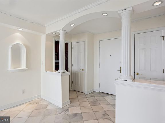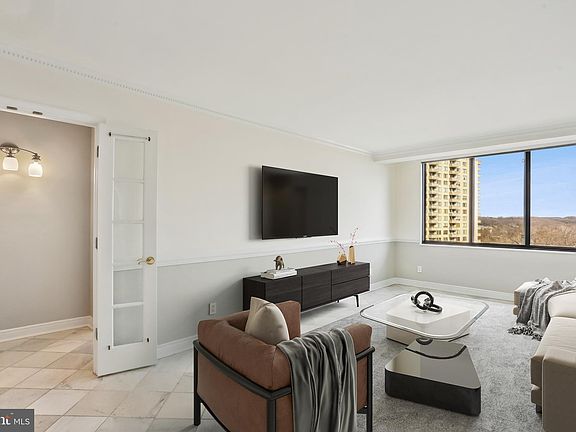 Welcome to The Promenade! Its sought-after location offers year-round resort style living in the heart of Bethesda. As you enter the foyer of this luxurious two bedroom, two bath apartment you will surely be impressed with its open concept living space. The entrance boasts two convenient guest closets with ceramic tile flooring that stretches throughout the main living areas. The sun -filled living room is richly designed with crown molding and is the perfect spot to entertain family and friends. The focal point of the home is the gourmet kitchen, featuring an abundance of custom cherry 42” cabinets that include a built-in pantry, ceramic tile backsplash, granite counter tops, stainless steel appliances (gas cooking) and large breakfast bar with seating for six. Enjoy your first cup of coffee in the dining room adjacent to the kitchen. Its sliding glass door opens to a generous size balcony with a picturesque view of the pool. One of the highlights of this unit is the handsome design of its home office/bonus room with lighted French doors, hardwood floors and built-in cabinets and desk. All anyone would ever need to work from home. The sweeping primary bedroom suite is extraordinary….brand new upgraded carpet, crown molding, recessed lights, spacious sitting room and sleeping room with ceiling fan with light and sliding glass door with second balcony. The closets in this suite are unbelievable with mirrored door closet, huge walk-in closet with custom built-ins and an additional walk-in closet in the primary bath. The luxury ceramic tile bath boasts a cherry vanity with double bowl sink with granite top and tub/shower. The second bedroom on the opposite side of the apartment is equally well appointed. Lighted French door welcomes you to this spacious bedroom with ceramic tile flooring, wall sconces, spacious walk-in closet, large window that floods the room with natural light and a second private bath. The bath features a long cherry vanity with a single sink with granite top and glass enclosed tub/shower. With its neutral décor and fresh paint this nearly 2000 sq. ft. apartment is ready for the buyer that demands perfection. Plenty of natural light and modern finishes complement the overall look and feel in this elegant unit. In addition, there are two of the best garage spaces in the building near the South elevator. The monthly fee includes property taxes, all utilities, basic cable, and access to amenities. The resort-style Promenade complex offers a vast array of amenities…indoor and outdoor pools, tennis and pickleball courts, state of the art fitness center, community garden, library, etc. The retail arcade includes Chef Tony’s restaurant, grocery store/deli, dry cleaners, travel agent, and beauty salon. Don’t miss your opportunity to experience luxury living, beautiful views, and unmatched amenities. The Promenade has it all!