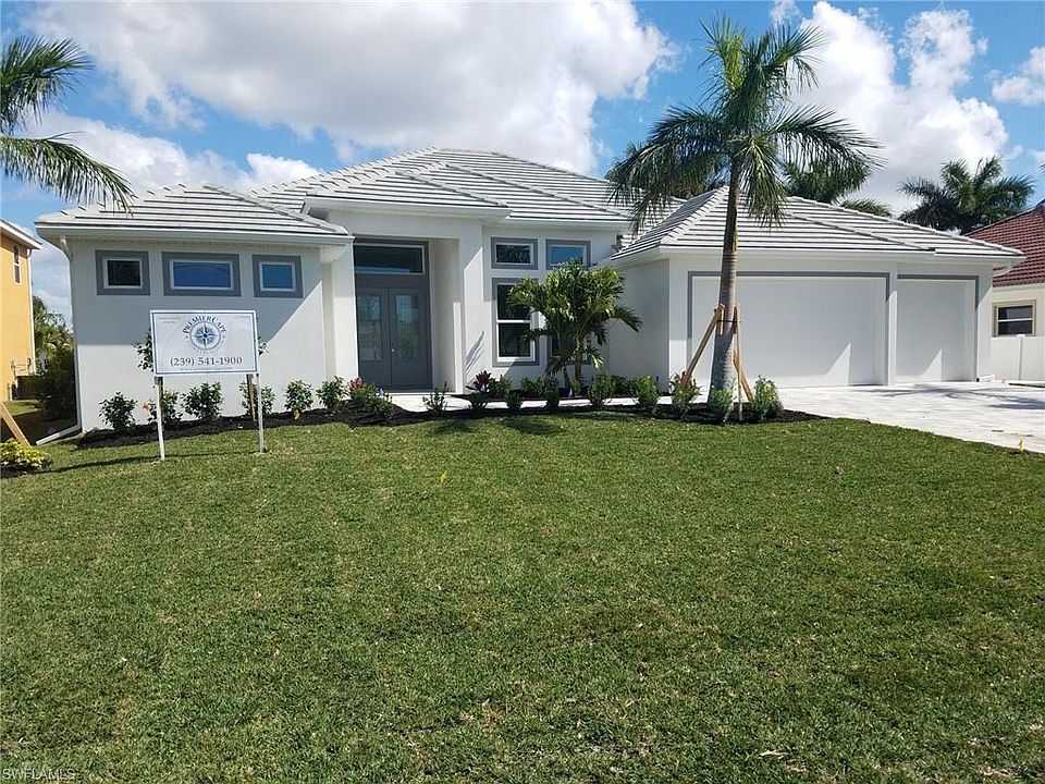 Fiesta Key Model by Premier Cape Construction is a beautifully designed Coastal Contemporary home with 2,476 square feet of elegant living area. The large Great Room with nine feet tall corner sliding glass doors extends the indoor living space to the outdoor Lanai and Pool area. The resort style pool and large paver deck with a panoramic picture window enclosure make this home perfect for entertaining. The Master Suite provides a relaxing retreat with a large walk-in shower and soaking tub. The two Guest Suites with bathrooms await your guests. The open Kitchen with large level island will delight the cooking enthusiast. All of this is situated on a Sail Boat Access Property in the Yacht Club Neighborhood