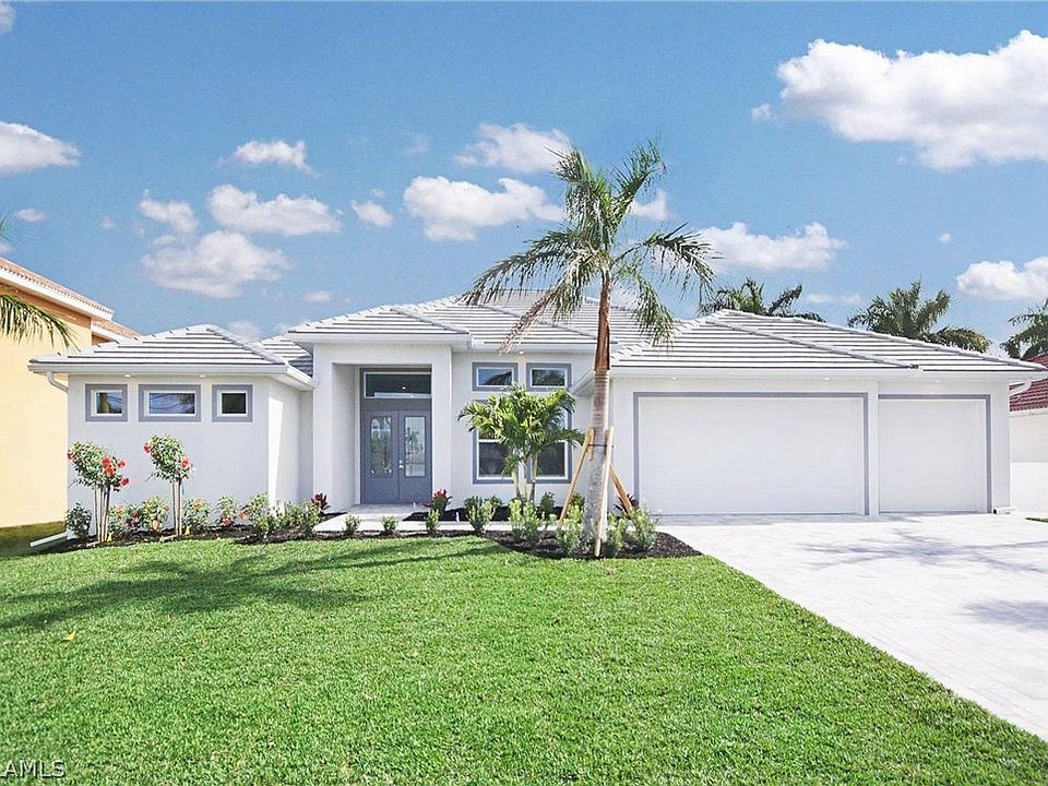 Fiesta Key Model by Premier Cape Construction is a beautifully designed Coastal Contemporary home with 2,476 square feet of elegant living area. The large Great Room with nine feet tall corner sliding glass doors extends the indoor living space to the outdoor Lanai and Pool area. The resort style pool and large paver deck with a panoramic picture window enclosure make this home perfect for entertaining. The Master Suite provides a relaxing retreat with a large walk-in shower and soaking tub. The two Guest Suites with bathrooms await your guests. The open Kitchen with large level island will delight the cooking enthusiast. All of this is situated on a Sail Boat Access Property in the Yacht Club Neighborhood