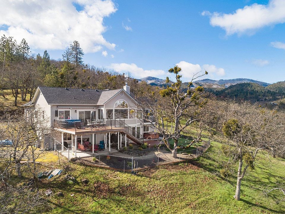 Unique property first time on the market! This is a 4 bedroom 3 bath home with 2228 sq. ft that sits on 5 acres in a very desirable area of the Rogue Valley. With unparalleled vistas of the valley. Ideally located close to wineries, 10 minutes to Jacksonville, 15 minutes to Ashland, 10 minutes to Medford, and 15 minutes to the Rogue Valley International Airport. With three bedrooms and two bathrooms located on the main floor, the fourth bedroom is downstairs with a private bathroom with a separate entrance. The two bathrooms recently remodeled in 2021 with walk in tile showers, and the primary bathroom has just been completed with walk in tile shower with picture window views of the Rogue Valley, the roof was installed in 2017, the home is energy efficient and features a 4.49kw Solar system that is owned. Outside there is a huge 440 Sq. Ft. deck where you can take in the views and entertain. There is also a lower deck with a spa for more private settin