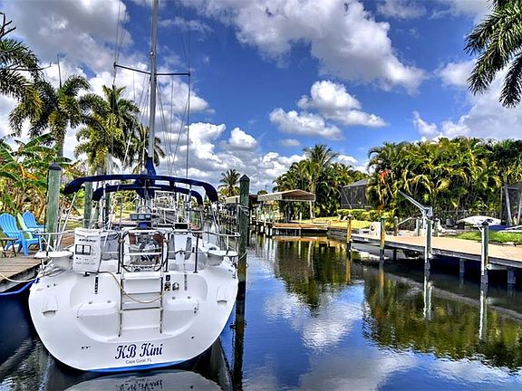 This charming gulf access canal home is located in the highly desirable Yacht Club area! Get to the Caloosahatchee River in just under 15 minutes with direct sailboat access and no bridges. Quiet street with no through traffic, and in walking distance to the Cape Coral Yacht Club which boasts a beach, community pool, The Boat House Restaurant and The Yacht Club Community Park with boat ramp, tennis courts, outdoor racquetball courts, a fishing pier, BBQ grills, playground, and more. This home is situated on a large lot with plenty of room for a pool, is equipped with a boat dock, lift, and 2 separate entertaining/seating areas out on the canal. It is perfect for someone wanting to live the Florida boating lifestyle or to be used as vacation rental. Come check out how adorable this home truly is! 2 bedrooms, 2 baths, and a private home office tucked away behind garage area. Plus, an additional 350+ extra square feet from the enclosed lanai not reflected in the total square footage of home!