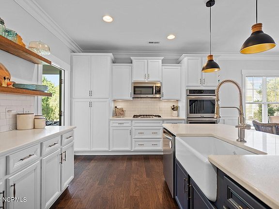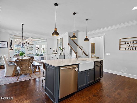 The perfect cottage home located in the beautiful waterfront community of Helms Port! Helms Port is a pristine gated community located along the Intracoastal Waterway and includes a protected marina, resort-style pool, state-of-the-art clubhouse, kayak storage and launch area, private sandy beach and a lovely community firepit overlooking the water. This well-appointed home feels like new and features an open floor plan with 4 bedrooms, 3 1/2 baths, a dedicated office and a lovely enclosed porch/sunroom. The large owner's suite is located on the first floor with 3 additional spacious bedrooms upstairs. The home is filled with custom features and upgrades, including shiplap walls in the living room, quartz kitchen countertops, farmhouse sink, pantry cabinet with pull out drawers, double wall oven, extended two car garage with built-in drop zone & a custom dog room that's absolutely adorable! Exterior features include a low maintenance yard, custom built-in firepit with privacy screens and a wonderful front porch for sipping coffee and catching up with neighbors. This home & community have it all so schedule your tour today!