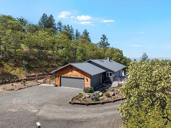 Perched above the valley on 5.04 private acres, this modern retreat offers panoramic views and serene luxury, only five miles from downtown Medford. A custom wrought iron gate, xeriscaped garden and inviting covered front porch welcome you and set the sophisticated tone. In the open living area, a vaulted ceiling, large windows, and spectacular views create a sense of space and light. Warm natural materials—wood ceilings, California chestnut floors, and stone tile—contrast beautifully with the clean, modern lines. The open chef's kitchen shines with quartz counters, custom cabinetry, and premium appliances. The primary suite features vaulted ceilings, spa-like bath, walk-in closet, and tranquil views. Enjoy sunrises and cool summer breezes from the generous wraparound deck with multiple seating areas. Extras include a smart laundry room, oversized garage, greenhouse, and a detached shop with power and carport. The discerning buyer will find a perfect blend of style, comfort and peace.