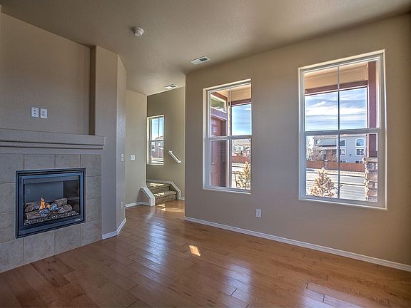 Charming 2 story End Unit townhome in Stetson Ridge South* Great location that has the front of the home back up to open space with unobstructed views of Pikes peak and the Rockies* Plenty of parking in the community and you have an attached 2 car garage* As walk in the main level you have an open concept living area with the Kitchen* Eat in Kitchen has a counter bar peninsula and a Dining nook off the side* 1/2 bath on the main level for convenience*Downstairs floors are upgraded to wood with gas fireplace * also has central heat and ac*home has all window blind treatments* Going upstairs you have 3 bedrooms*The master bedroom adjoins to a full bath with double sinks and walk in closet* The 2nd and 3rd bedroom share a full bath on the upper level hallway as well* Laundry is located on the upper level* The townhome community is minutes away from the Powers Corridor that is close to shopping, movie theater, and fine restaurants*
