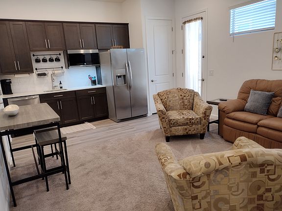 Small private side yardWhite quartz countersQueen size bedDark espresso cabinetsStainless steel appliances