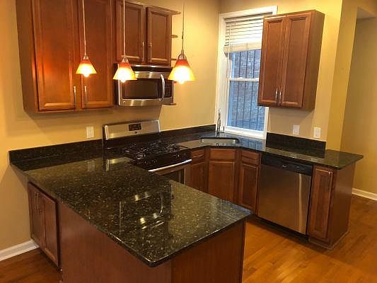 Large, open floor plan: Garden apartment. Two bedrooms, 1.5 full baths. Kitchen has stainless steel appliances and granite counter-tops. Hardwood floors; washer-dryer. Fenced-in yard with private patio.