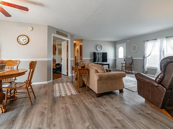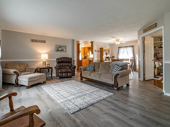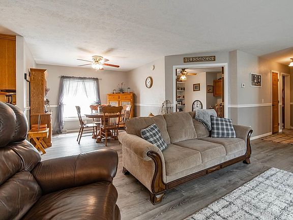 Picture perfect 3 bedroom, 2 bath vinyl sided small town ranch home situated on a generous 120X150 corner lot! Interior features a bright and airy open living/dining concept with recently installed luxury vinyl flooring, a beautiful fully equipped kitchen with custom cabinetry, adjacent laundry facilities, and a rear facing exterior access point, great den/office area with hardwood flooring and built-ins, a 9X22 enclosed/finished breezeway, and a popular split bedroom concept. The master boasts great space along with a large private full adjacent bath with a whirlpool tub, separate shower, and a walk-in closet -- the other two bedrooms are situated on opposite side of home and feature an adjacent full hall bath. Property also features a large rear deck, 22X28 2+ car attached garage, large detached workshop with both an attached storage shed as well as a covered patio, concrete off-street RV parking, newer roof (2010), Carrier HVAC (2013, private septic system -- A MUST VIEW PROPERTY!