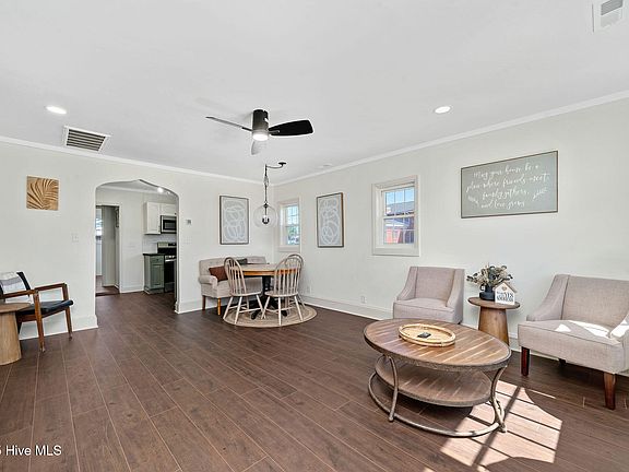 This beautifully renovated single-family home in the heart of Wallace, NC, is move-in ready and full of charm. Step inside and be greeted by a bright and inviting space with new laminate-water proof flooring, freshly painted walls in a creamy white with a contrast color on the doors and trim for extra character. New ceiling fan and all new light fixtures. Do you love arches? This home features two stunning original arches that serve as gorgeous focal points. Tired of the all white kitchen? we are too! This kitchen has been updated with professionally painted two-toned cabinets, floating shelves stained and sealed, butcher block countertops, a brand-new 33'' white sink, white subway tile, new light fixtures, AND a full stainless-steel appliance package! The laundry room is super spacious with a coat closet, an additional closet for extra storage and a brand new water heater - oh yeah... The washer and dryer are yours too! The bathrooms have brand new light fixtures and vanities with refinished tubs.
