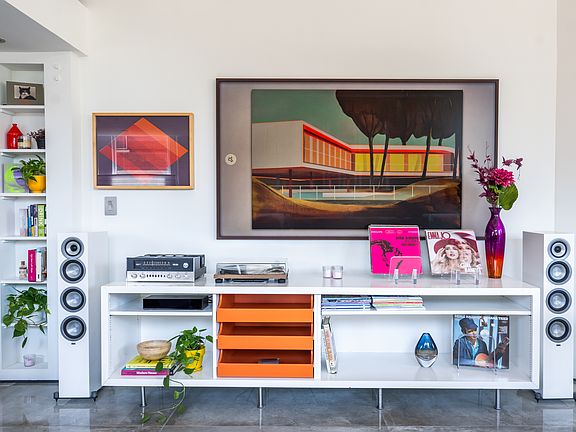 The new Samsung Frame/ART TV, 10" white with orange drawer entertainment cabinet, and the kitchen island/bar included with unit! Remaining furniture/art could be added to the lease, piece by piece or all together, for additional fees.