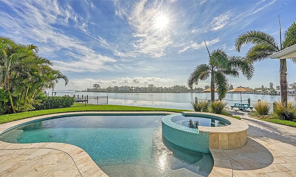 Do you want to live in a beautiful waterfront home with outdoor kitchen, pool, dock and wide water views? Featured in Home & Design Magazine, this luxury waterfront home is in the Key Royale neighborhood of Holmes Beach. It is the epitome of gracious coastal living. Professional designers, attention to detail and high end finishes made this a one-of-a-kind home with its renovation down to the studs in 2016 including new electric, plumbing & seawall. Entering the Jeld-Wen double front doors, your first word will be "Wow!". Unfolding before you is a breathtaking great room with wide water (not canal) views, an expansive 1600+/- SF travertine pool deck, shaded loggia with custom wood ceiling, outdoor kitchen with hot/cold sink and Lynx propane grill plus 20' X 20' dock (with water & electric) on sailboat water (lift allowed). The great room is light-filled and includes custom built-in’s, fireplace, vaulted 15’ ceilings and full wall of hurricane impact sliders/windows showcasing long water views to Anna Maria Sound. The thoughtful design includes porcelain floors throughout (no carpet!) and an inviting kitchen worthy of a chef's dream featuring quartz counters, Mother of Pearl mosaic backsplash, custom cabinetry with roll outs (Campbell Cabinetry Designs), "Delta Touch” faucet, stainless farm sink, under cabinet lighting, 36" Wolf professional gas range with griddle, architectural range hood, Bosch dishwasher, Sub-Zero refrigerator with custom cabinet panels, Wolf microwave drawer and Wolf steam oven. The open floor plan is complemented by additional inviting spaces to enjoy your Florida lifestyle including a den with dual desk areas, sliders out to the loggia and barn door that ensconces the room into a functional home office, second lounging space or serene 4th bedroom. The waterfront primary bedroom is a luxury destination unto itself with water views, custom coffered 10' ceilings, plush ensuite bathroom, and direct access to the pool, spa, outdoor shower and water's edge. Getting ready for your day, you have the choice of two large closets with custom built-ins and your spa-like bathroom invites you to relax with its fine finishes including generously sized custom shower, quartz counters and refined tile work. For complete privacy, there are two additional bedrooms with sumptuous bathroom nestled on the other side of the home. All bedrooms were designed to be inviting, restful places with direct access to the lanai, pool and bay. The attention to detail continues in the luxe laundry room with raised LG appliances, quartz counters and floor to ceiling pantry with roll outs. For worry free living, this concrete block home was built to rigorous standards including a hurricane strapped metal roof, Hardie Board siding, Andersen Hurricane windows/sliders, 2 garages (one plumbed for conversion to a 4th or 5th bedroom/bathroom) and a TRANSFERRABLE FLOOD INSURANCE POLICY WITH A CURRENT PREMIUM OF $3800/YEAR. There's also a Trane HVAC system with Wi-Fi enabled thermostat, whole house surge protector, spray foam insulation, tankless water heater, WI-FI enabled garage doors, hard wired smoke/fire alarms, wiring for onsite and remote audio/video surveillance and bedside panic button. Imagine living the luxury lifestyle you've always dreamed of. Drift off to sleep as the moon rises over the bay, awaken to the glow of the sunrise on the water, then meander to the beach or enjoy the island's par 32 nine-hole private golf course. This could be yours!