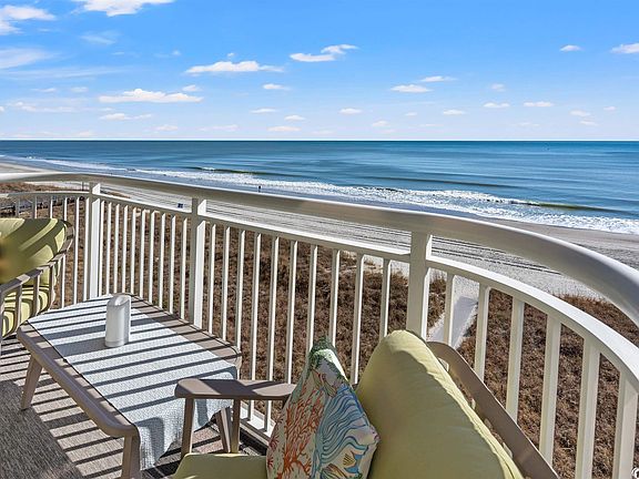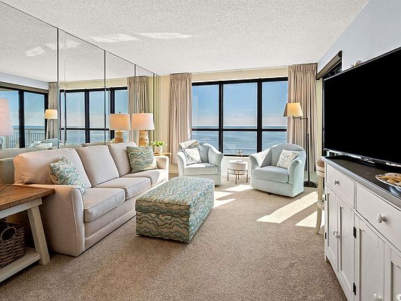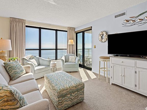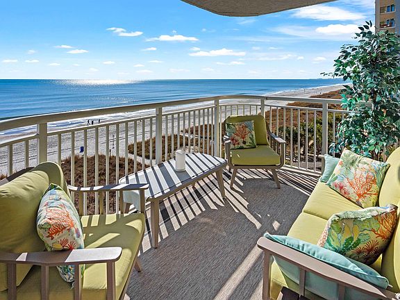 The oceanfront view from the living room of this condo is superior to the oceanfront view from the living room of most oceanfront condos. The depth, width & placement of the oceanfront windows, along with an inspired floor plan, & the 6th floor elevation contribute to a sense of intimacy not just with the ocean but also with the beach & the waves lapping the shoreline. A view this good is rare among oceanfront condos. In addition to the phenomenal straight on ocean view, there is a wonderful sense of this condo being almost a corner one. The south side of the living room is closer to the ocean than the heated square footage of the rest of the building to the south, & the fully corner balcony is closer to the ocean than the rest of the non-heated square footage of the building to the south. These things, along with the fortunate placement on its site of the next building to the south, as well as the distance to that building, allow for a wonderful view for miles down the beach, as well as straight in front. You can see the curve of the beach & the city lights twinkling in the distance at night. The master bedroom is direct oceanfront, with ocean view thru ocean-facing sliding glass doors. The current owners do not rent & have lovingly maintained the interior. New in 2023: master bedroom wooden furniture set, hot water heater, master bath shower with glazed porcelain walls. New 2021: refrigerator, dishwasher, HVAC indoor & outdoor units. New 2020: deck furniture. New 2018 to 2022: dining room set & most living room furniture. New 2017 to 2018: granite counter tops in kitchen & bathrooms. New 2017: w/d, microwave, stove. The condo is beautifully furnished & extensively equipped. On-site 3 level parking; spacious owner's lobby with seating, large screen TV, dining tables, kitchen with refrigerator & microwave, exercise equipment, sauna, & steam room; mail boxes with extra ones for larger items; oceanfront deck with warming table "firepit", chairs, lounge chairs, grills, & numerous picnic tables most with umbrellas during the summer. Indoor pool heated seasonally & with window wall opened in the summer to let breezes blow thru. Indoor whirlpool. Gaze at the ocean from your condo, swim in the covered pool, & sit on your covered balcony. A dermatologist's dream! Owners allowed golf carts. Easy walking distance to Main Street with its shag clubs, shops, and restaurants. Features, amenities, measurements, square footage, etc. not guaranteed. Buyer responsible for verification.
