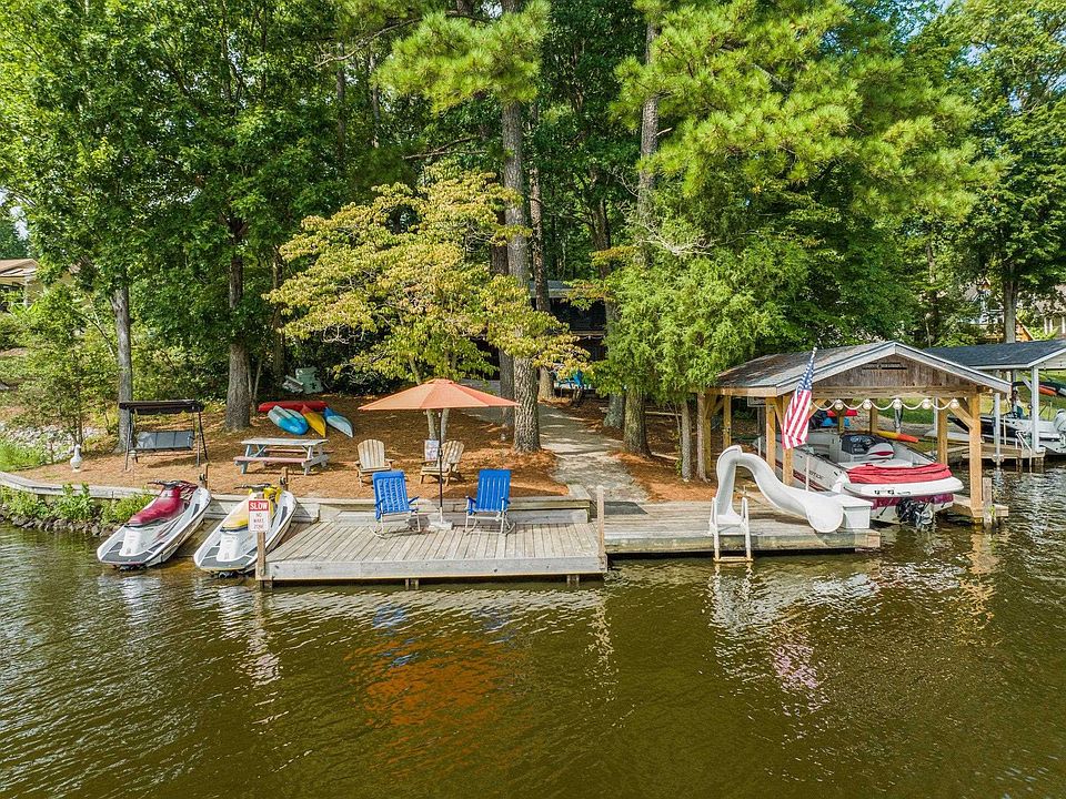 PRIME All Brick, MAIN Waterfront, Move-in Ready Ranch. An exclusive updated 2 bedroom, one and a half bath, home strategically nestled on a private, wooded 1/2 + Acre Lot. Step onto the expansive screened porch or relax on the covered patio. This is by far one of the loveliest waterfront lots on the lake with a large dock, two jet ski ramps and a rebuilt boathouse. The unfinished walk-out basement to double the living space has room for a bonus with enough extra beds to sleep 6 additional and a large workroom that could be an additional full bath. New roof, insulation, appliances and many more upgrades. Do not wait to look because it will not last long! Lake Royale is the Triangles Premier Lake and Golf Resort Community. Amenities include a 3.25-mile-long lake, an 18-hole golf course, beaches, marinas, miniature golf, shuffleboard, corn hole, pickleball, community pool and activities for all!