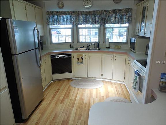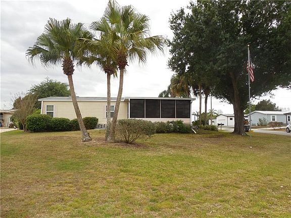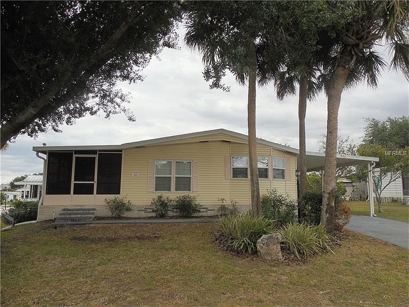 Well-kept home on nice, shaded, corner lot. Brand new AC this year. New roof ordered, but will not be installed until November of 2018. Missing shingles were replaced after the hurricane. It is not leaking at this time. Most of the rooms have laminate flooring. The master bedroom is very large. The hallway has built-in storage. There is a golf cart garage and nice carport. The kitchen has a smooth-top stove, stainless steel refrigerator, pantry, optional center island and breakfast bar. The living room is very roomy and opens to a vinyl room with a nice view. The laundry room has room for a desk. The home is very clean and is move-in ready. The park features 2 clubhouses, 2 pools, a golf course, tennis courts, horseshoe courts, workout room, library, pool tables and of course, plenty of activities. Own your own land with very low monthly fees. Come and enjoy your retirement home. Most of the furniture stays.
