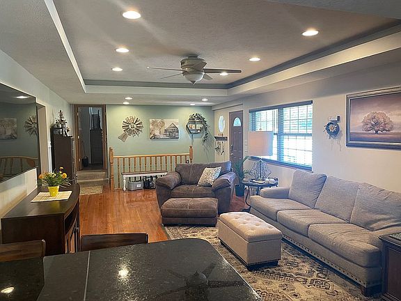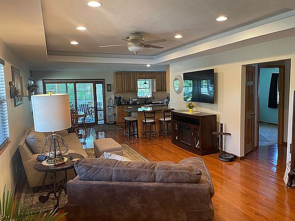 In town country acreage ranch style home. 4 bedroom, 2 1/2 bath, 2,220 square foot with new windows. Open living/dining with hardwood floors. New kitchen upgrade with granite and breakfast bar. Large master offering DBL closet, attached full size bathroom. Double attached garage. Partial basement with family room. 2 non compliant bedrooms in basement. Sunroom with view of secluded pond, patio, surrounded by mature trees. Above ground pool 16 x 8 x 42 with concrete curbing. 36 x 64 pole building. Peaceful retreat. Move in ready.