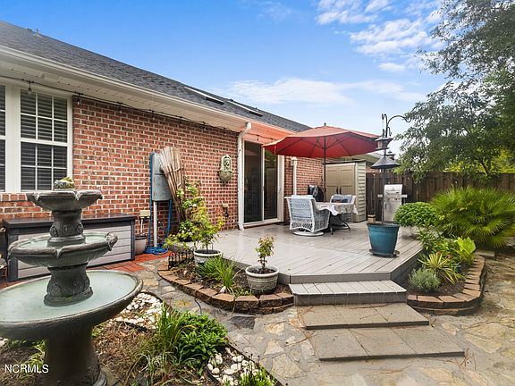 Discover the perfect blend of comfort and style in this stunning townhome nestled in the desirable Carleton Place community. This property was updated in 2017 with high end features. As you step inside, you'll be greeted by a bright and airy living area filled with natural light. Modern kitchen featuring granite countertops and stainless Maytag appliances. Manufactured hardwood floors in all living areas, custom guest bathroom shower with glass door and tiled floors. The Primary suite, a true sanctuary with a walk-in closet with extra shelving and a luxurious en-suite bathroom complete with a soaking tub/shower combo and tiled floors. Your private fenced tree-lined backyard oasis provides a serene setting for relaxation while you enjoy the large Trex decking and ample space to make it a garden paradise. This home's updates also include custom lighting, 2'' blinds in all windows, Moen fixtures in kitchen/baths, keyless entry, lever door handles, TWO 40-gallon water tanks, sliding glass door and so much more. Located just minutes from beaches, UNCW, shopping, and dining, this home offers the best of both convenience and tranquility. (Refrige, W/D, shed & fountain do not convey)