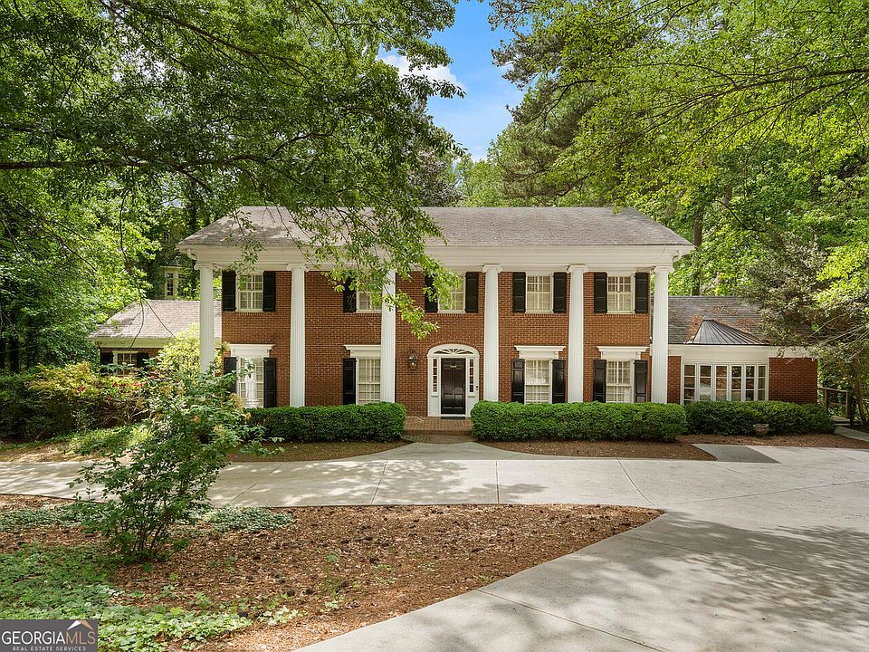 Your own private sanctuary on Northside Drive, a stately Georgian Colonial home on an expansive lot. A grand, travertine tiled foyer welcomes you, setting the tone for a refined and relaxed interior style. This is a wonderful home for entertaining guests, with formal living and dining rooms, a brick-floored den with a wet bar and wood burning fireplace, and a covered deck that spans the length of the house overlooking a brick patio and immense backyard. Beautiful marble exterior counters, solid cherry wood cabinetry, and a central island anchor the kitchen in the rear of the house. The primary suite is on the main floor, separate from three large bedrooms plus an office flex space upstairs, with an elegant bathroom featuring a beautiful soaking tub. There is tremendous potential to create even more space in the unfinished, walkout basement. The backyard is a real gem, lush with shrubs, bushes and trees. It is also ready for a pool, play area, and tennis court. Easy access to major roads and highways, excellent public and private schools, grocery stores and restaurants in Sandy Springs and Buckhead.