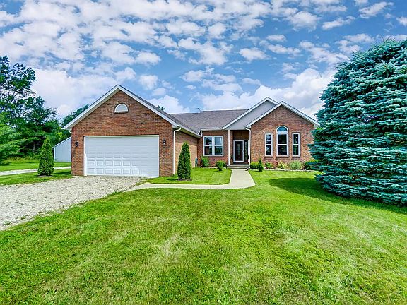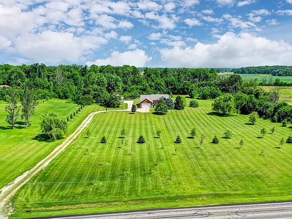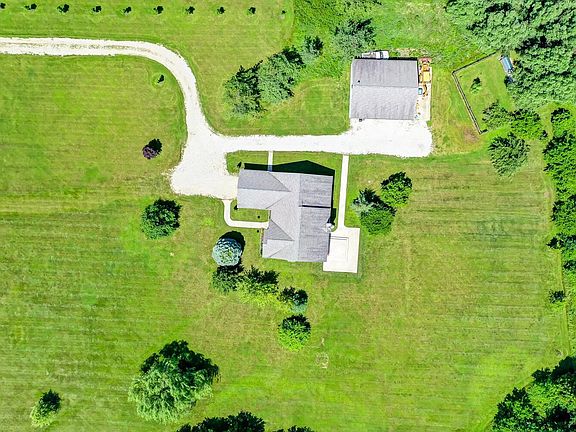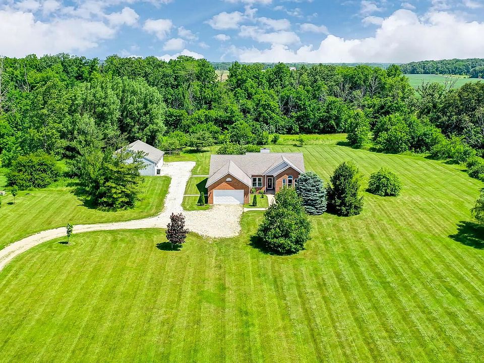 Country living at it's finest with this gorgeous brick and stucco ranch on 5 acres. Privacy abounds in this expansive yard. Relax on the rear patio that overlooks the gorgeous tree line. Additional outbuilding perfect for hobbies or additional storage. The main living areas feature high ceilings, gorgeous solid wood floors, trim and doors. Brick floor to ceiling fireplace is quite the focal point in the great room. 42'' cabinets with tons of storage in the kitchen complete with granite and stainless appliances. Large owner's suite with huge bathroom complete with soaking tub, shower, dual vanity and large closet. Large mudroom/laundry area with granite folding table. Newly finished basement adds an abundance of space! This is the one you've been waiting for!