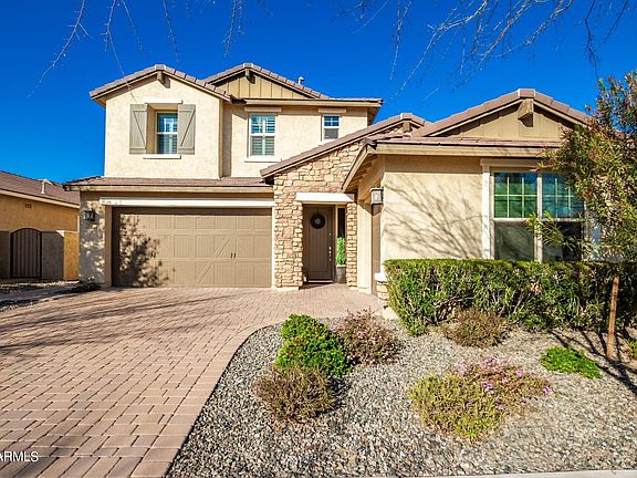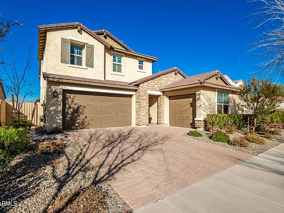 Located in a highly sought-after, gated community in Eastmark, this home is less than 10 years old with magnificent curb appeal with stone & pavers, & sits on a generously sized lot. The home features over $60K in upgrades after it was built with a gourmet white kitchen/butler pantry, high vaulted ceilings, downstairs den, upstairs loft, desirable floor plan with 2 bedrooms that have jack & jill bathrooms, laundry upstairs, guest bathroom upstairs with dual sinks, a powder bathroom downstairs for guests, & a spa-like master en-suite bathroom. The entire house has upgraded fixtures and features throughout, laundry has gas or electric option, water softener system, epoxy in garage, 3 car tandem garage & a 4th car garage with windows- Ideal for work shop space. Full list of upgrades in Do