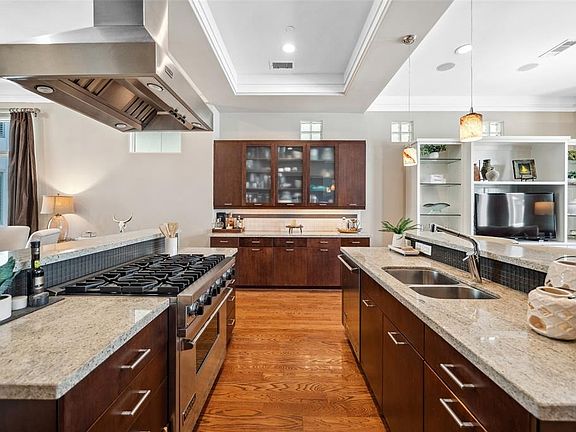 The open-concept main level features a spacious study, gourmet kitchen with Viking stainless steel appliances and dark wood cabinetry, flowing into a den and dining area perfect for entertaining all flood-free and overlooking a serene park-like courtyard.
