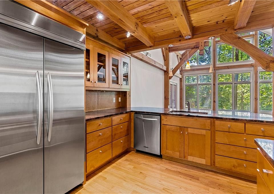 This stylish, custom-built home combines rustic charm with modern conveniences. Tucked into the woods, this one-of-a-kind home features cedar beams framing the interior, open concept living, high end appliances, built-in refrigerator, and cozy outdoor areas making this home a true masterpiece. Enjoy access to Lake Lanier with a short, easy (5-6 min) walk to your shared platform DOCK! Three bedrooms and all conveniences on the main level makes this the perfect home for retirement or a growing family. Upstairs you will find a spacious beamed loft and additional room for office, hobbies, bunk room, game room, you name it! The huge 5+ car attached garage (with 220 volt outlets) awaits your hobbies, tools, and toys and the unfinished basement leaves plenty of room to grow! Storage galore throughout the house! Convenient to Lake Lanier, medical, schools, grocery, restaurants, North Ga Mountains, Hwys i985, 365 & GA400.