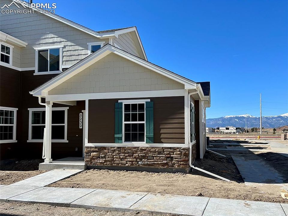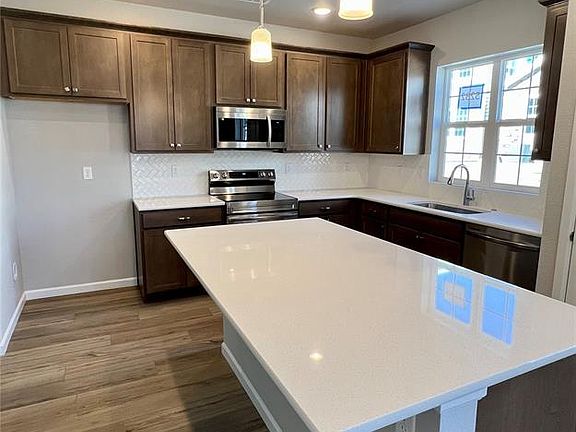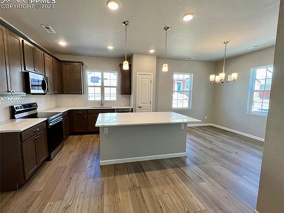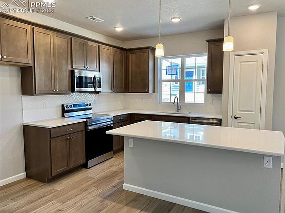 The open-concept Parque floor plan features a main level primary bedroom with en-suite bath including separate vanities, quartz counters, stand-alone shower with bench seat, and large walk-in closet. Gourmet kitchen offers a large center island with eating bar, quartz counters, pantry, herringbone tile backsplash, and stainless steel appliance package. Custom metal railing at stairs and LVP flooring throughout main level living areas. Upper level bedrooms both feature walk-in closets. Tons of great standard and energy saving features including 9’ ceilings on the main level, A/C, tankless water heater, radon ready (vent and pre-wire), dual pane windows, and generous insulation package. Enjoy all that Wolf Ranch has to offer including fenced courtyards, large green space common areas, pool membership, dog park, walking/biking trails, Wolf Lake with fishing, kayaking and paddle boarding. Easy access to D-20 schools, gyms, hospitals, the Powers corridor, and I-25.